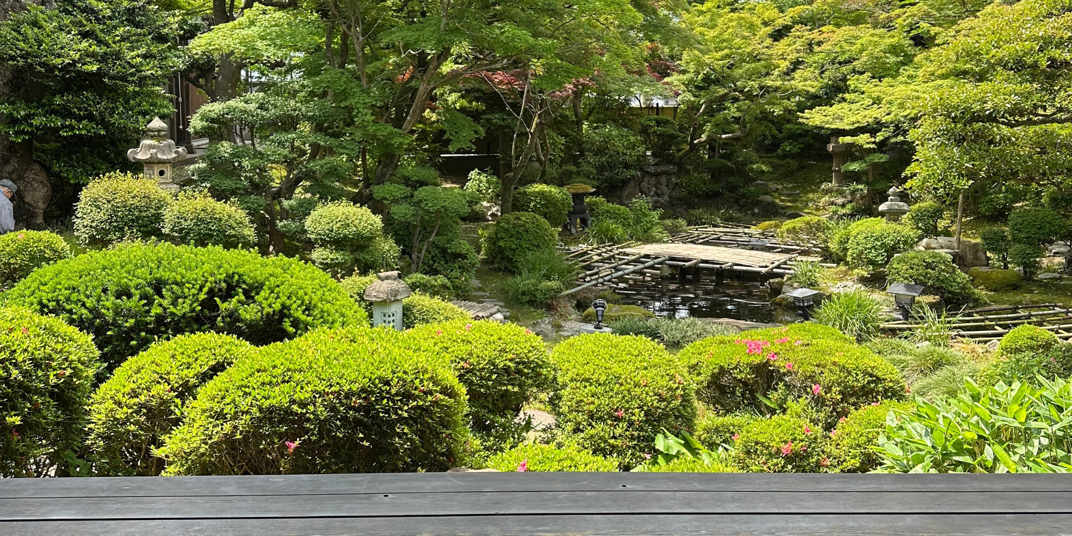 樹齢400年を超える大木が並ぶ陽願寺の御殿庭園。季節ごとに表情を変える日本庭園を楽しめます。御住職の柔和なお話で心がほどける時間を過ごすことができます。