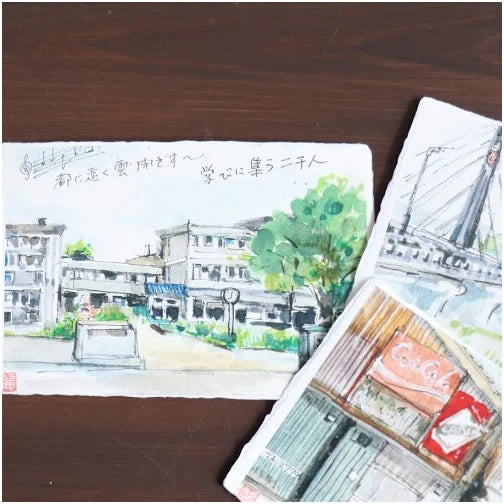 越前和紙に原画の色あいを忠実に再現しながら、プリントされた作品です。和紙らしい風合いが水彩画のタッチにとてもあっていて、ノスタルジックな想いが湧き上がってきます。大きさはポストカードと同様。