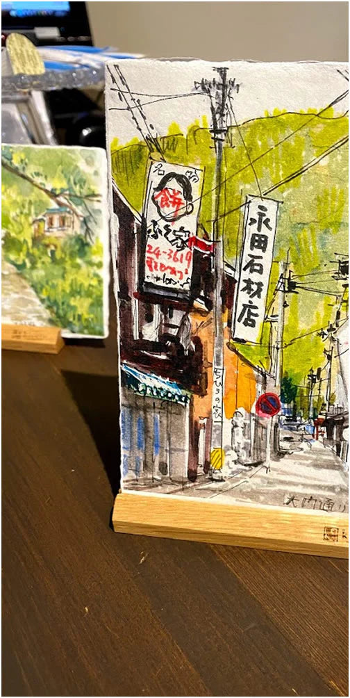 越前和紙に描かれた水彩画がどこか懐かしさや癒しをもたらしてくれます。「たけふ」にゆかりのある方も、そうでない方にもお薦めです。