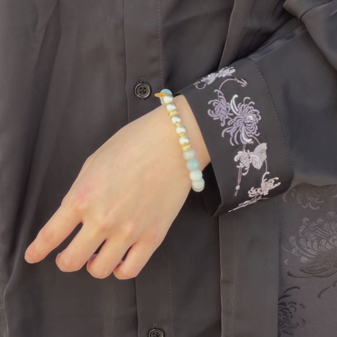 天然石は、自然が育んだ味わい深い表情と色合いを持ち、ひとつひとつに唯一無二の美しさがあります。職人がひとつひとつ手作業で箔を施した、箔座独自のパーツ「箔珠」と合わせて、大人の装いにフィットする上品なブレスレットが誕生しました。